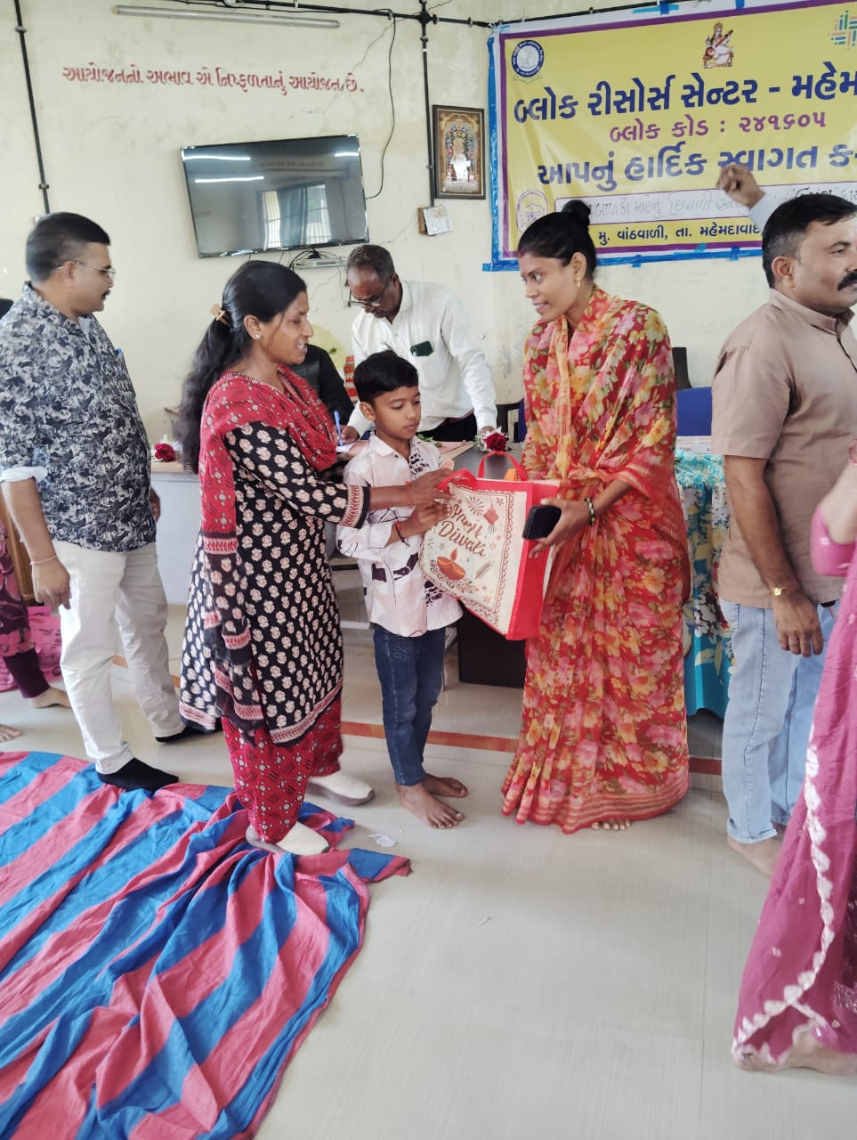 જેમાં ફટાકડા, મીઠાઈ, ફરસાણ, બિસ્કીટ, ગિફ્ટ આપવામાં આવી હતી.આ કાર્યક્રમમાં અધ્યક્ષ તરીકે મહેમદાવાદ 117 વિદ્યાનસભાના ધારાસભ્ય અર્જુનસિંહ ચૌહાણ, વિનોદભાઈ ડાભી, વિષ્ણુભાઈ ડાભી, નિલેશ ભાઈ ચૌહાણ, સિદ્ધિ વિનાયક દેવસ્થાન ના મહંત,રસિકભાઈ પરમાર,વિપુલ ભાઈ ઠક્કર,પુનમભાઈ ડાભી, નિકુંજભાઈ પ્રજાપતિ,દિપકભાઈ સુથાર અને દાતાઓ,સ્પેશ્યલ એજ્યુકેટર તમામ, સી આર સી કો ઓ તમામ, બ્લોક સ્ટાફ તમામ તેમજ બાળકો અને વાલીઓ ઉપસ્થિત રહ્યા હતા. જે બાદ ઉપસ્થિત મહેમાનો દ્વારા બાળકો ને દિવાળી ની શુભેચ્છાઓ આપી કીટનુ વિતરણ કરવામાં આવ્યું હતું.આ સાથે સાથે દિવ્યાંગ બાળકો દ્વારા તૈયાર કરવામાં આવેલ દિવાળી કાર્ડ અને દીવડા દ્વારા મહેમાનનું સ્વાગત કરવામાં આવ્યું હતું.આ સમગ્ર આયોજન શિક્ષક સોશિયલ ગ્રુપ તેમજ બી આર સી ભવન દ્વારા કરવામાં આવ્યું હતું.